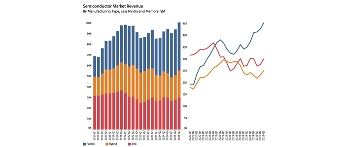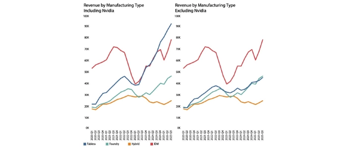 Comme on peut le constater, les revenus issus du modèle fabless croissent plus rapidement que ceux des autres modèles — et il n’est un secret pour personne que cette dynamique est largement tirée par les revenus de Nvidia.