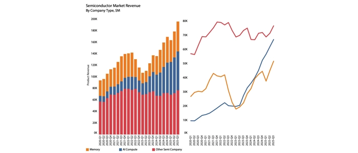 Pour l’observer, j’utilise une autre forme de déconstruction, en répartissant le chiffre d’affaires du marché des semi-conducteurs entre entreprises d’IA de calcul, entreprises de mémoire et autres acteurs.