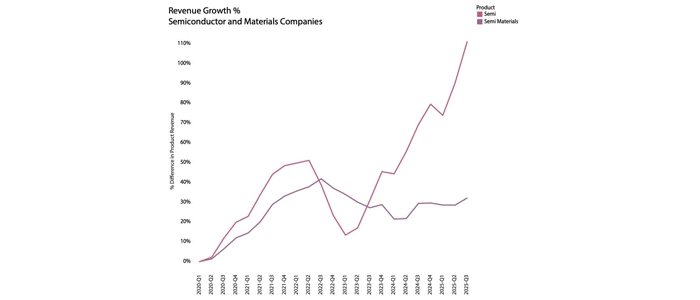 La révolution de l’IA a brisé le cycle traditionnel des semi-conducteurs, et rien n’indique un retour rapide aux « bonnes vieilles habitudes ». La croissance des revenus globaux est principalement tirée par l’IA et n’apporte que peu de bénéfices à la chaîne d’approvisionnement. Les entreprises de la supply chain des semi-conducteurs restent encore environ 10 % en dessous de leur pic de revenus, tandis que les revenus globaux du secteur ont progressé de 37 % sur la même période.