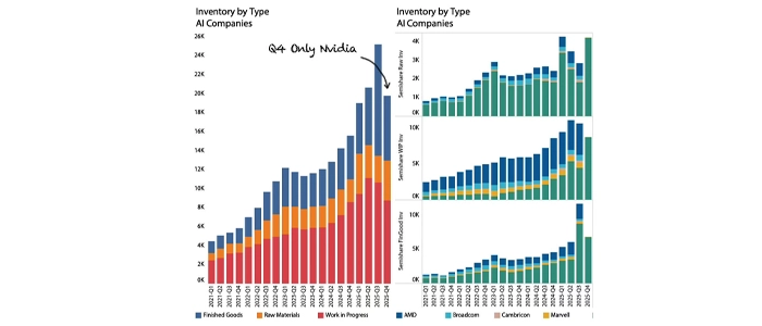 Lorsque l’on se tourne vers les stocks des entreprises d’IA, la situation apparaît radicalement différente. J’ai inclus les stocks de Nvidia pour le quatrième trimestre, ceux-ci ayant connu des variations significatives.