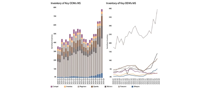 Il convient de rappeler que les stocks sont comptabilisés à leur coût de production. Une analyse des stocks n’est donc pas affectée par les marges élevées de l’IA ni par l’augmentation des marges dans la mémoire. Elle fournit ainsi une lecture plus fidèle des niveaux d’activité réels selon les catégories de produits qu’une analyse fondée uniquement sur les revenus.