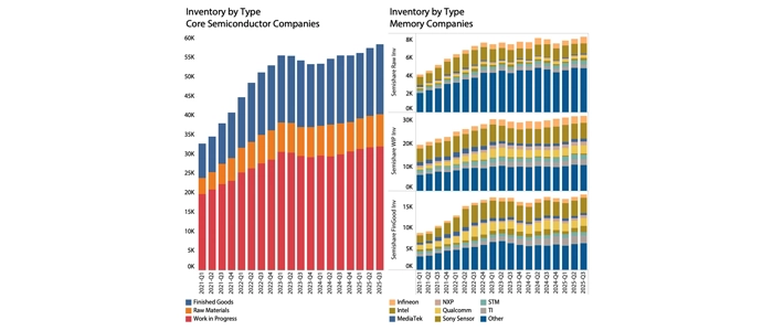 Nous avons vu précédemment que les entreprises d’IA représentaient 34 % des revenus du secteur, mais seulement 19 % des stocks cumulés de l’industrie des semi-conducteurs. Bien que les différents modèles de fabrication génèrent des structures de stocks distinctes — et qu’ils ne soient pas comparables sous tous les angles — l’exercice reste néanmoins pertinent.