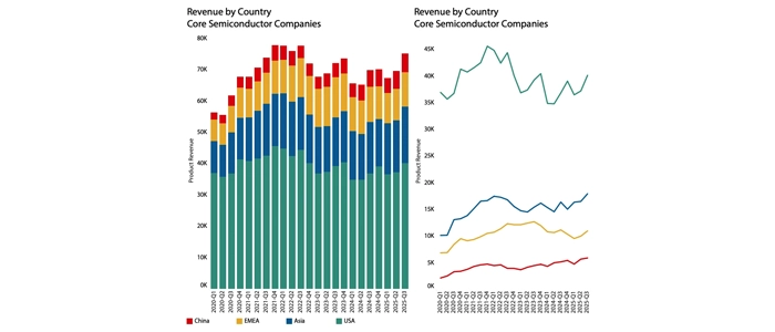 Un peu moins d’un quart des revenus des semi-conducteurs chinois est visible à travers les entreprises cotées, et est présenté ci-dessous en comparaison avec les revenus des entreprises constituant le cœur du marché des semi-conducteurs.