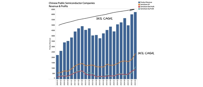 Sur la même période, alors que les marchés domestiques chinois restaient relativement atones, les entreprises chinoises de semi-conducteurs cotées en Bourse ont connu une véritable envolée. Leurs revenus ont progressé à un taux de croissance annuel composé supérieur à 26 %, tandis que les revenus totaux des entreprises constituant le cœur du marché des semi-conducteurs ont augmenté de moins de 3 %.